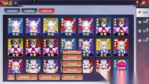 第四种方式为品质激活羁绊。妖怪有蓝色、紫色、金色、红色及粉色这几种品质。不同品质的妖怪,其属性差异显著。把相同品质的妖怪组合在一起,能够激活暴击伤害的羁绊属性。然而,高品级妖怪较难获取。因此,大家在合适的时期选用合适品级的妖怪即可,在游戏中后期再慢慢收集也来得及。