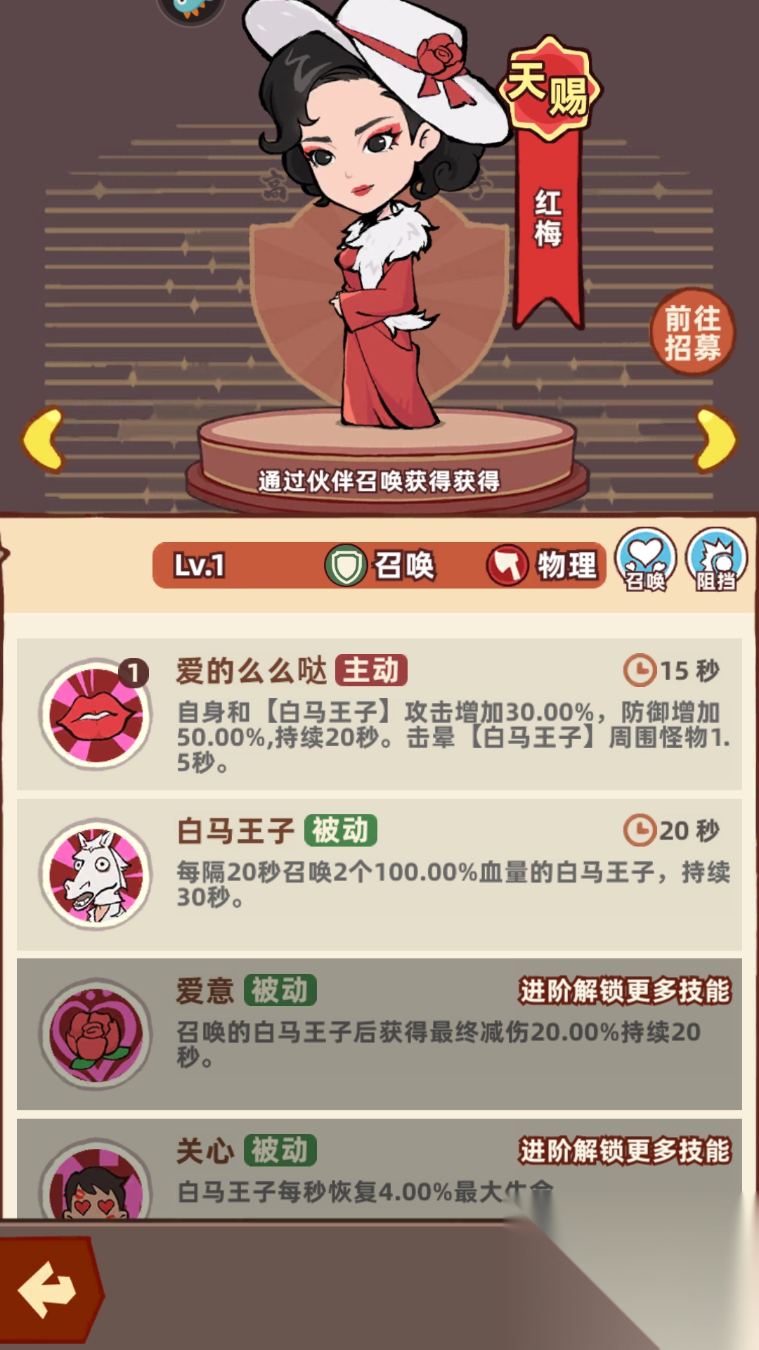 红梅每隔一段时间会召唤2个白马王子,红梅的被动技能可以给白马王子进行减伤和每秒回复一定的血量;红梅开启主动技能,会增加白马王子自身的攻击力和防御力,并击晕白马王子周围的敌人;和电筒西一样,红梅的召唤物可以吸收敌人的攻击,而且由于红梅的主动技能是可以增加自身和召唤物的攻击力,这样红梅和白马王子也有一定的输出能力,大侠可以根据实际需要进行选择。