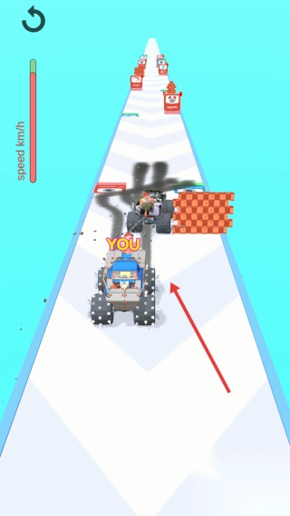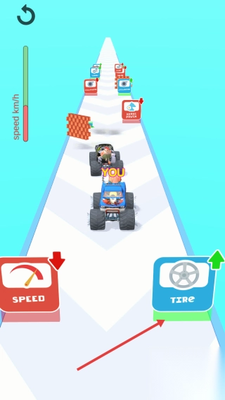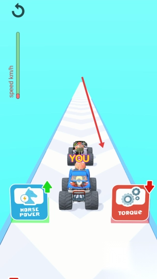 1、操控蓝色怪兽车,沿赛道竞速,遇【TORQUE】【TIRE】道具,优先选提升属性。