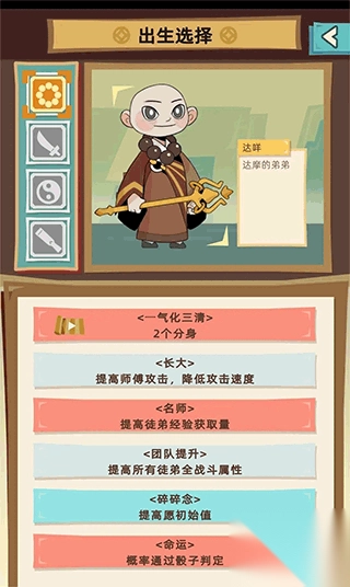 最初是出生选择,刚开始仅能挑选咱们的“达咩”,即达摩的弟弟,接着能够选取三个天赋。这些天赋能在一定程度上增减某些属性,亦或是带来一些特殊加成。完成选择后,我们便正式踏上西行取经之路啦!