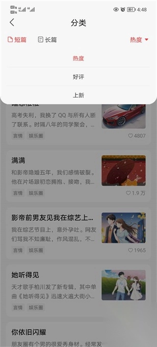 言情、现实情感、悬疑、惊悚、脑洞、科幻、武侠、权谋、玄幻奇幻、民间奇闻等各类故事,为你带来更丰富的阅读感受,助你迅速定位心仪故事!