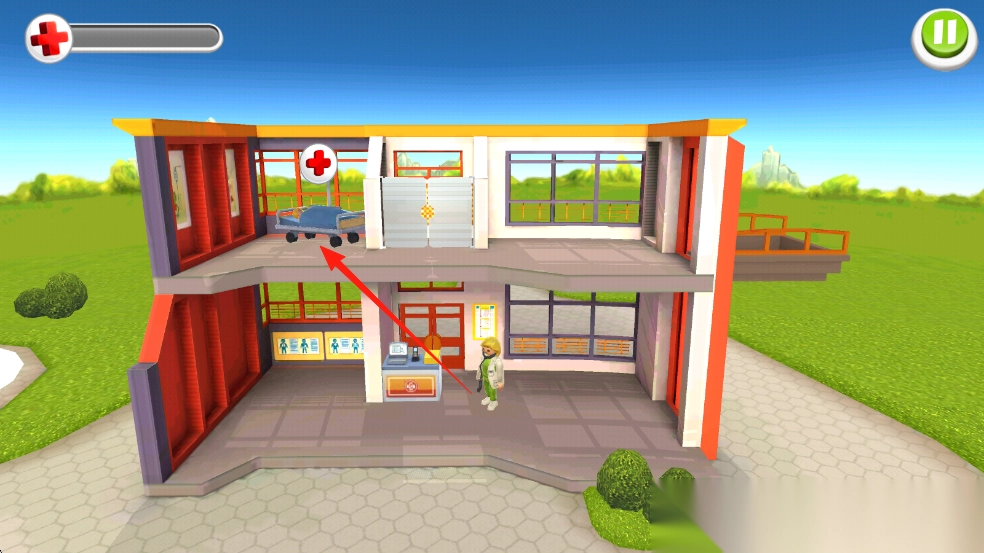3、将患者转移到一楼科室(红箭头),与护士协作,使用医疗设施,恢复患者健康值,推进关卡。