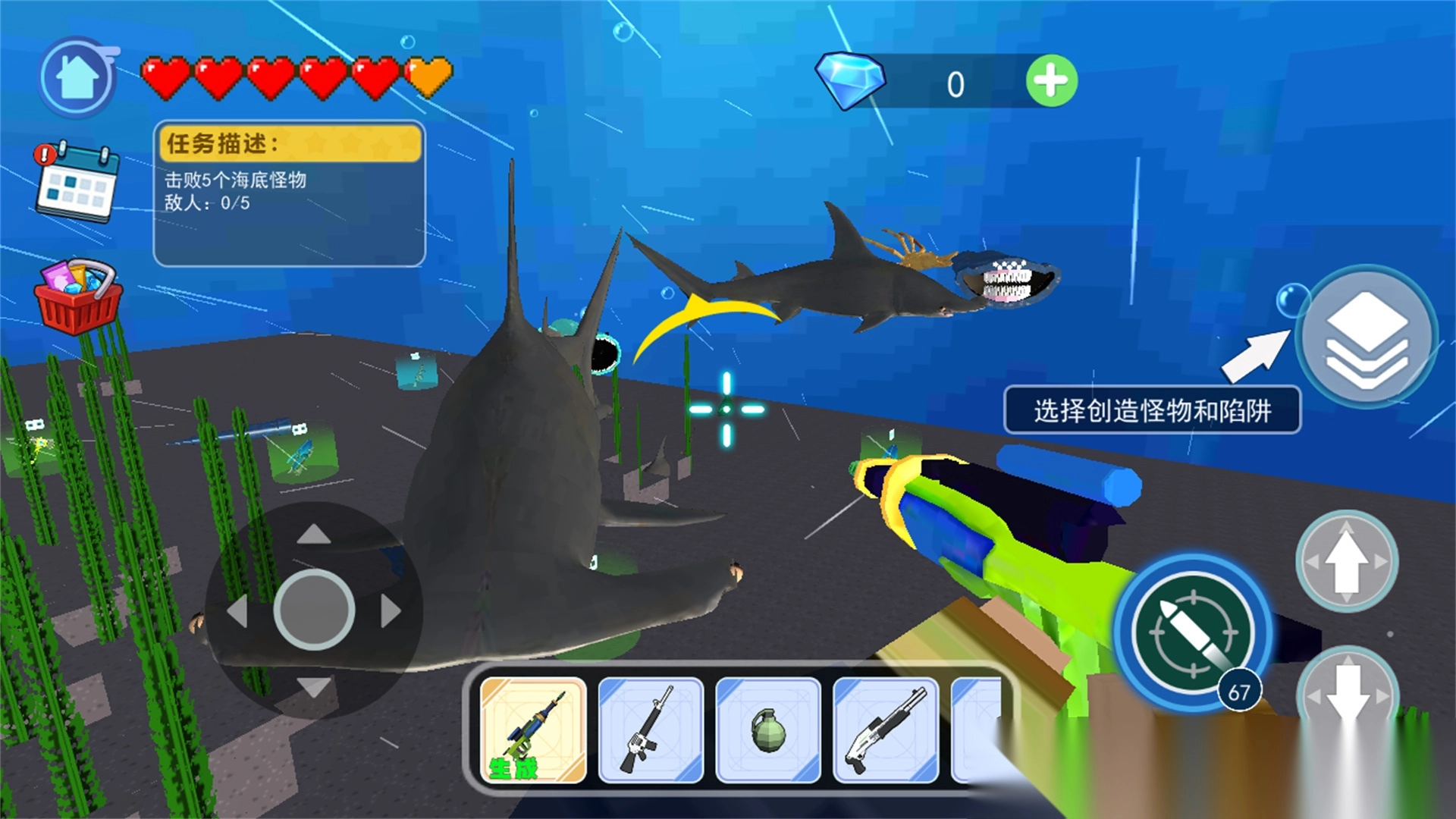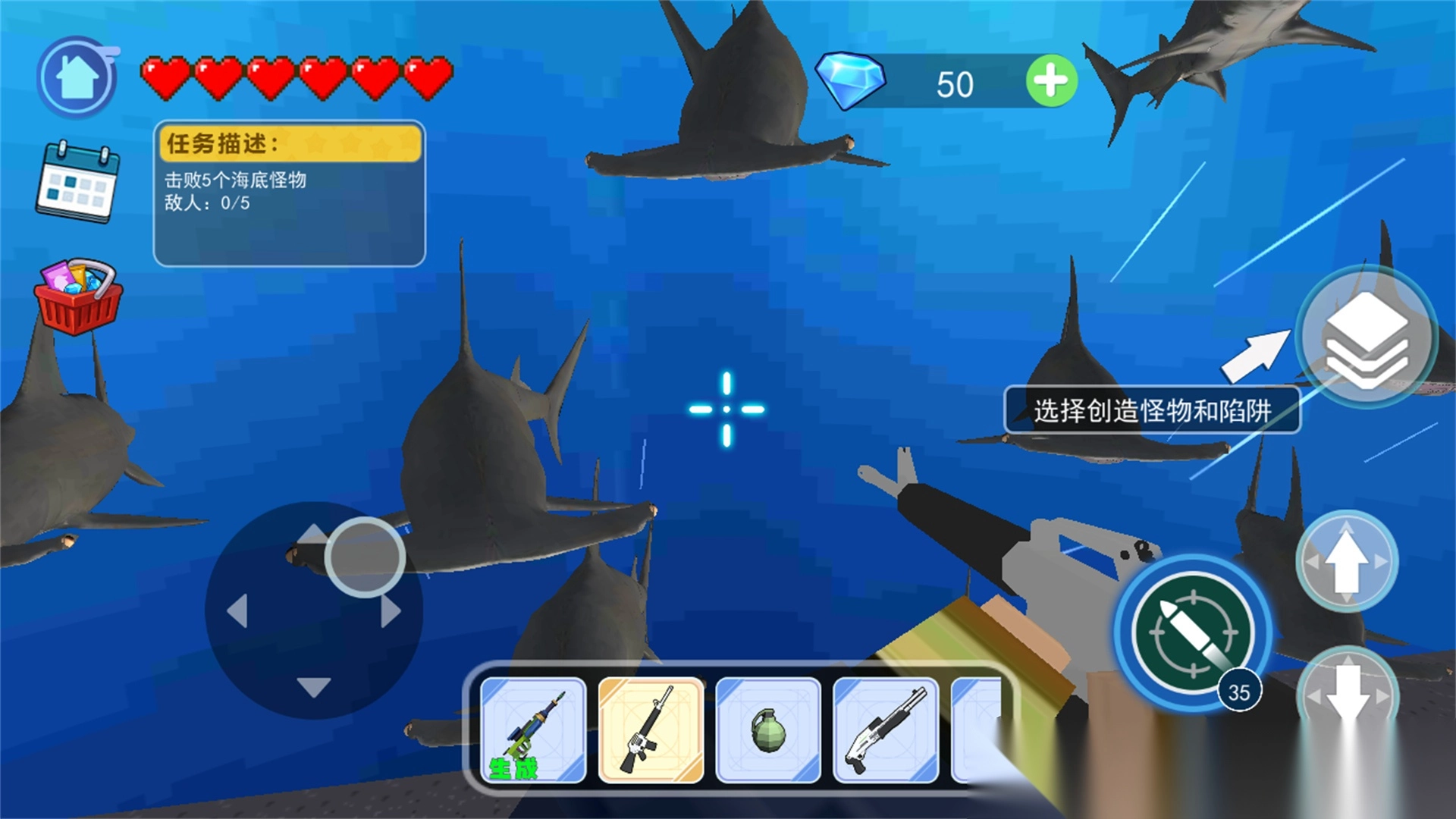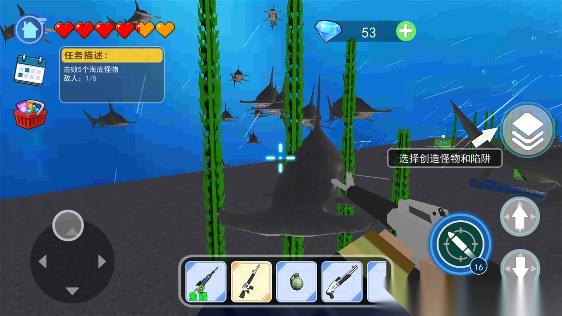 1、用枪械、手雷等武器,攻击鲨鱼完成任务,收集资源强化战力。