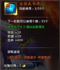 (3)坐骑成长丹可以通过坐骑进阶副本掉落或者声望商店兑换获得;
