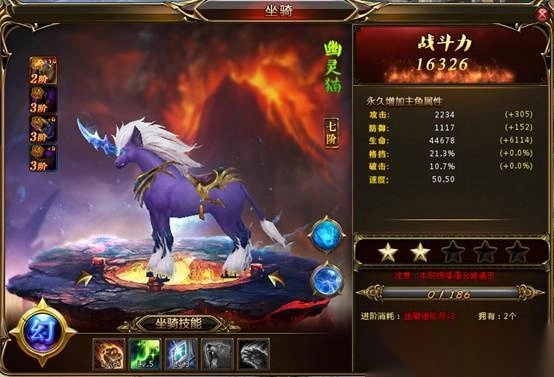 (1)坐骑不仅仅只是一个交通工具,更可以增加人物角色的各项属性,提升坐骑的阶数,不只增加更多的属性,并可获得更炫酷外形的高级坐骑。