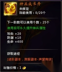 (3)神兵成长丹可以通过神兵进阶副本掉落或者声望商店兑换获得;