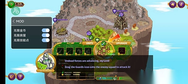 3、成功过关后,可对各类兵种展开升级操作。具体方式为点击基地或者兵营,接着点击“UPGRADE”即可实现升级。若想加快游戏进程,点击左下角的箭头便可。