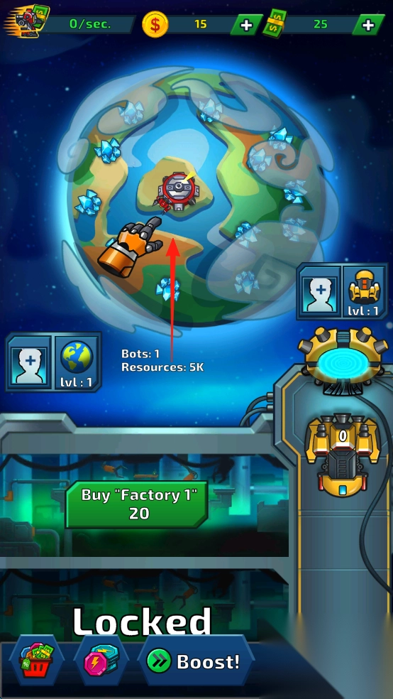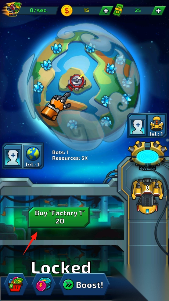 1. 点击【Buy“Factory1”20】(见红箭头指示处),消耗20金币,尝试解锁工厂,以此提升资源产能。