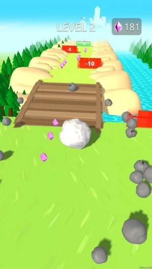 2、注意躲避红色障碍物,碰到会导致体积缩小,保持稳定操作让巨石在坡道上持续加速前进。