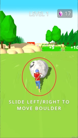 1、点击屏幕释放巨石开始滚动,通过左右滑动控制前进方向,收集沿途的绿色宝石增加体积分数。