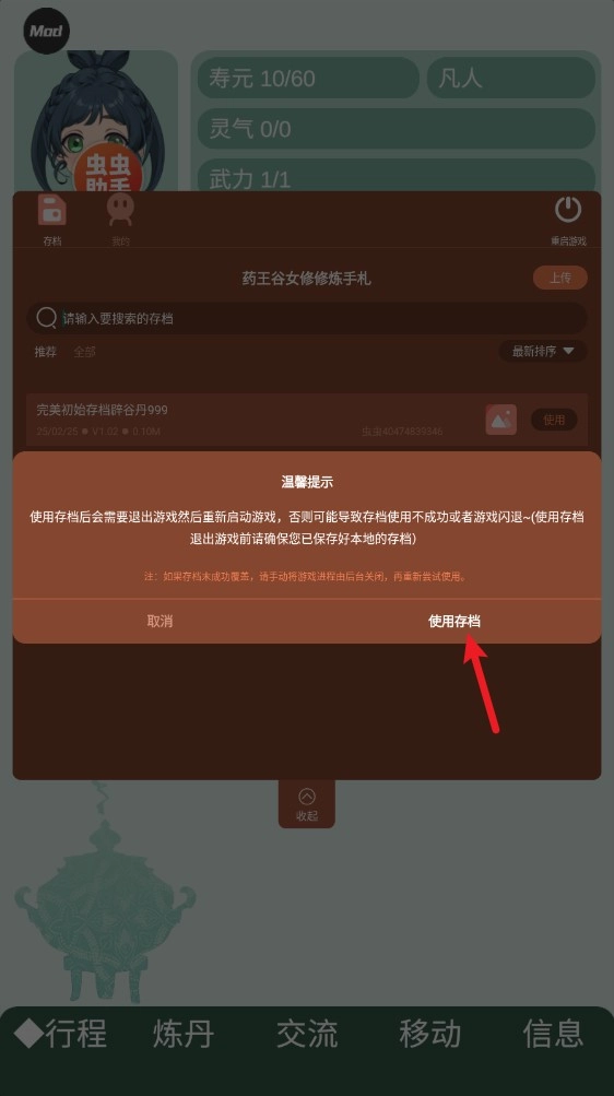 3、下载好之后会跳出使用存档的提示,点击后会重启游戏。