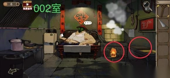 13、进入002室,点击右侧菜板获得菜刀,返回005室选中菜刀点击右下角木盒获得火炬。