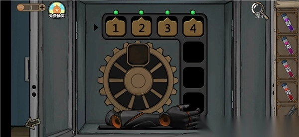 9、点击地球仪获得发光二极管,然后进入004室,在桌子上获得火钳,点击桌子左下角的密码箱,选中发光二极管安装后解锁小游戏(很不错的小游戏,要在6次机会内解锁密码。可以先输入12 34然后根据颜色来推断,黄色的可以调整位置。红色的数字就是没有的,把红色数字更换为后续数字)。通关小游戏后获得扳手。