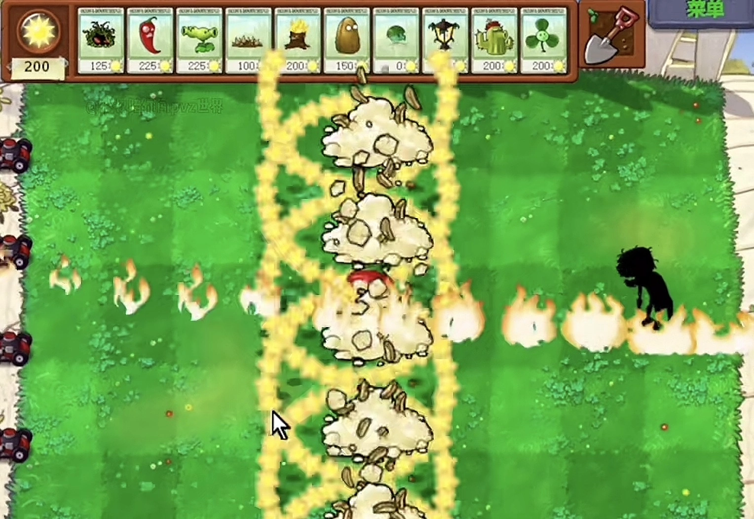 除了原有的火焰,还会致使该列发生土豆雷爆炸,且伴有星星出现,片刻之后,会再度释放出两排辣椒的效果。