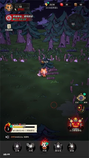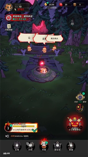 4、在主界面点击左下角可以完成各种任务获得奖励,点击下方的天赋可以对角色进行升级。