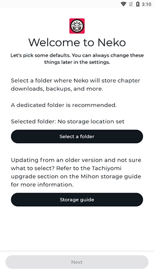 2、挑选一个文件夹,Neko会在此文件夹中存放章节下载、备份等内容。建议使用专用文件夹。