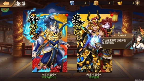 2. 玩家能够开展神将与天金这两种类型的招募。