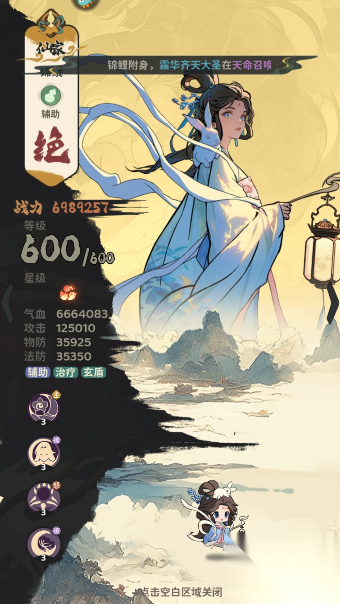 每7秒为我方全体英雄恢复气血,恢复量为嫦娥气血上限1.5%。