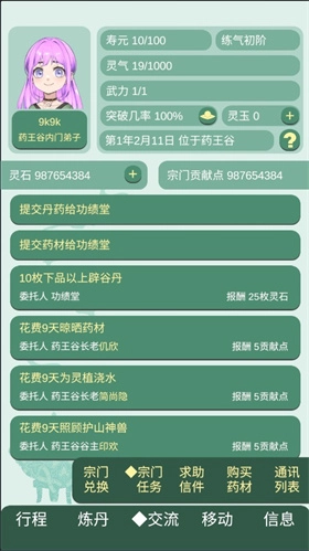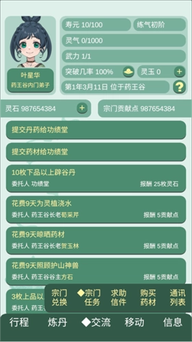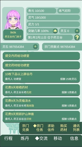 3、交流:完成宗门的一些任务和购买材料。