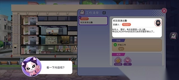 4、点击“信封”解锁你的第一个工作,您的好伙伴Teddy给你发来了出勤祝贺,顺利完成工作会有丰厚的奖励,点击“完成”即可获得奖励。