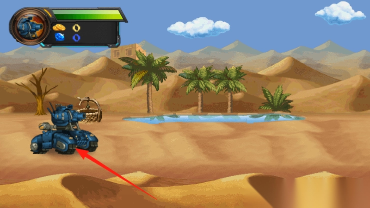 1、开动那辆满是锈迹的初始战车,驶入荒芜的沙漠赛道。手指按住屏幕,发射机枪,将前方的摩托敌兵击退,就此开启这场竞速射击的冒险之旅。