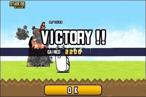 然后进入第四关,先将金钱上限升级为二级,然后召唤14个大男子主义猫开始进攻,注意敌军有了一个全新的兵种,是一种类人生物,如果抵挡不住了可以使用猫炮进行攻击,基本上过关就没有悬念了。