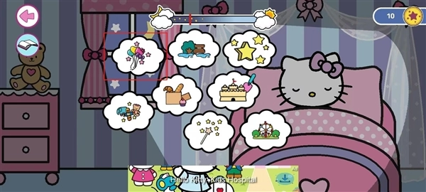 5、凯蒂猫只要有想要的东西,头顶上就会冒出气泡,当全部点完以后,再关灯;之后就可以点击左上角的那个按钮;
