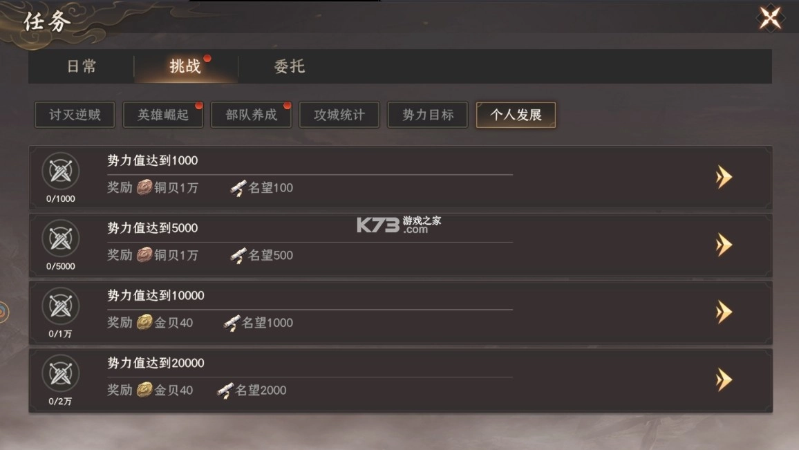 这种几乎挂机都能完成的战斗奖励,绝对不能错过。挑战模块中的其他任务,比如英雄崛起、部队养成、攻城统计、个人发展等,需要玩家们有进一步的发展,比如将任意武将升级、参与城战、攻占城市、提升势力等,零氪玩家们前期能获取的铜贝主要就在这里了。