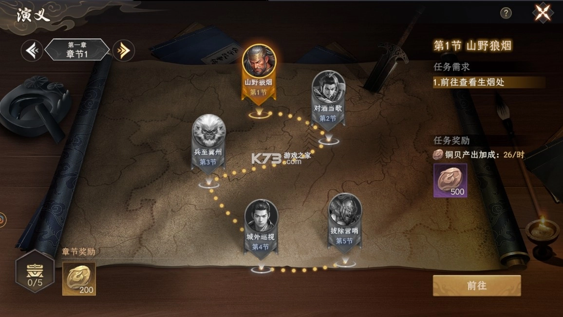 历练分为演义、周游和法阵,演义模块中需要玩家派遣部队到指定地点开始任务,完成章节中的所有任务后可以领取章节奖励,完成每关的全部章节后,还能自动获取额外奖励,演义任务完成后还可以提高铸币所的基础铜贝产出。