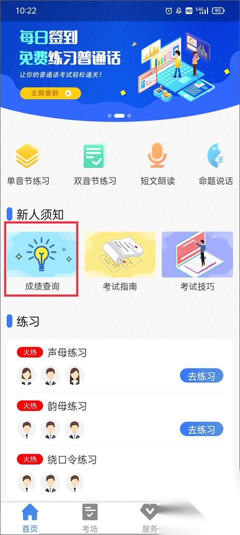 1、打开软件并自动切换到【首页】,这个功能界面主要分为了三个部分:主要功能、新人须知以及练习,点击新人须知中的“成绩查询”。