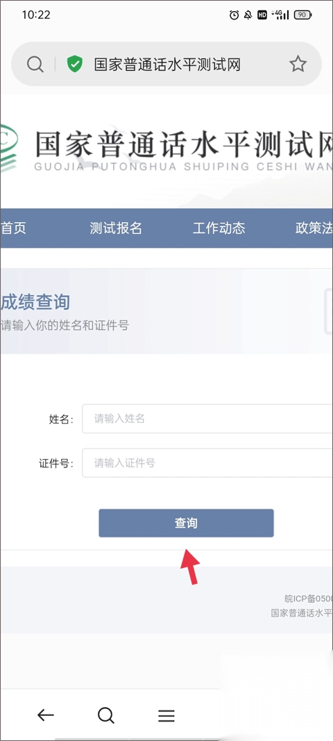 2、这时页面自动打开浏览器的页面,并进入到国家普通话水平测试网站,在这里你只需要输入姓名和证件号,点击查询按钮即可查看到普通话等级考试成绩。