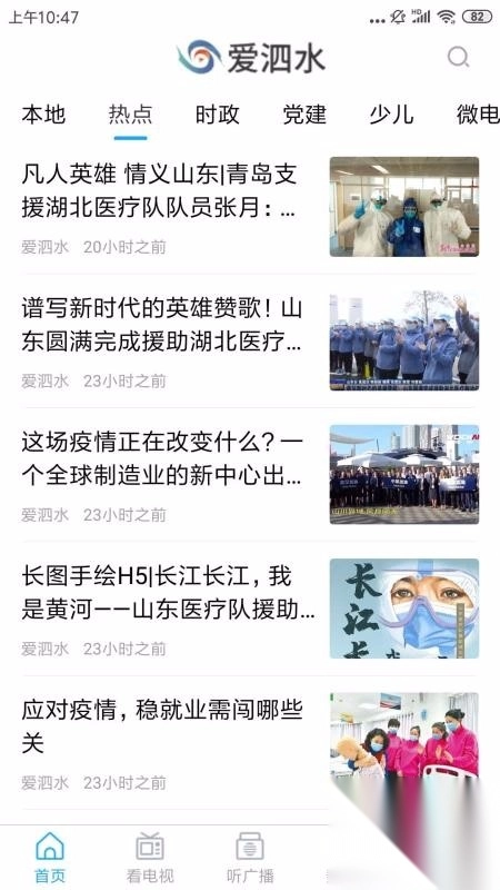 首页向用户展示了本地、热点、时政、党建、微电、少儿等诸多资讯板块。