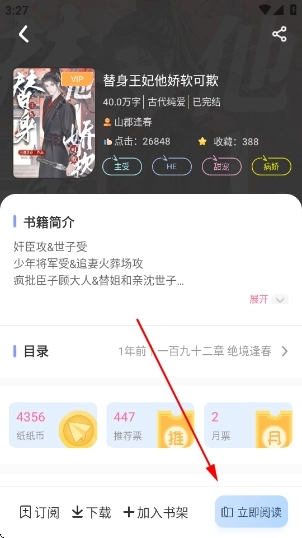 5、点开想看的小说进入详情页面,点击“立即阅读”。