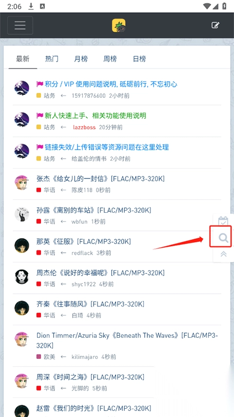 1. 打开音乐磁场APP,轻点右上角的【放大镜】图标,从而进入搜索页面。