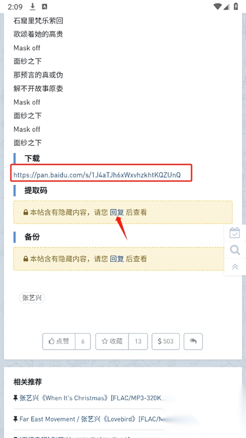 4、向下滑动至页面底部,就能瞧见网盘下载地址,不过提取码默认处于隐藏状态。此时,点击【回复】按钮,在评论区随便留下些话语(比如“感谢分享”)即可。