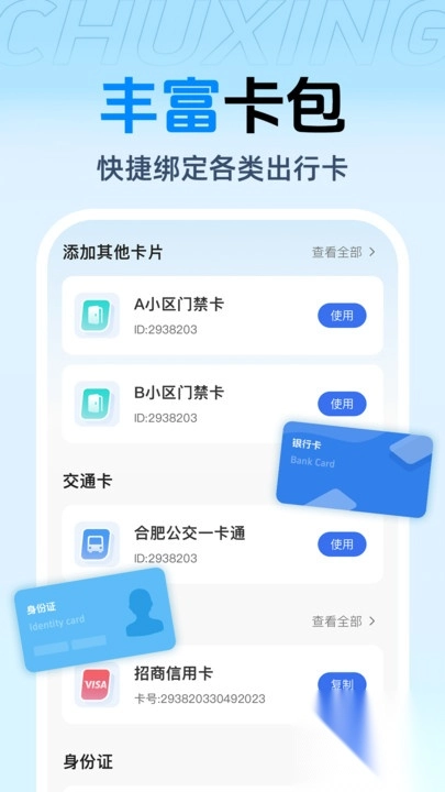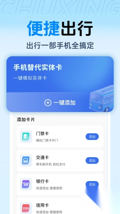 2、支持一键模拟实体卡、快速添加各类交通卡,告别繁琐的卡片携带。