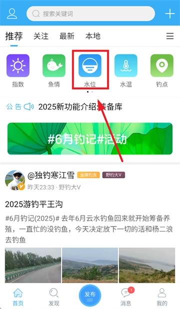 首先下载野钓之家app,完成安装后打开该应用。进入野钓之家app界面后,找到并点击“水位”选项。