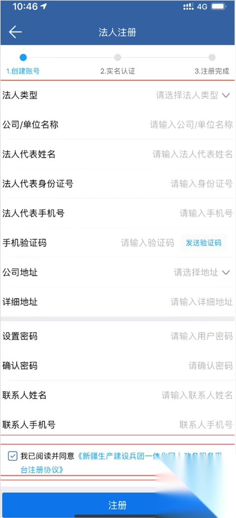 法人进行注册时,需如实填写法人类型、公司(单位)名称、法人代表姓名、法人代表身份证号码、法人代表手机号码、公司地址以及详细地址等相关信息,以完成注册流程。