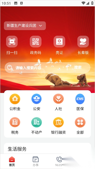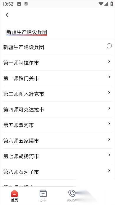 完成注册与实名认证后,登录App或PC端网页,在首页点击 “新疆生产建设兵团”,依据办理业务或查询业务所需的区域,选择不同站点。