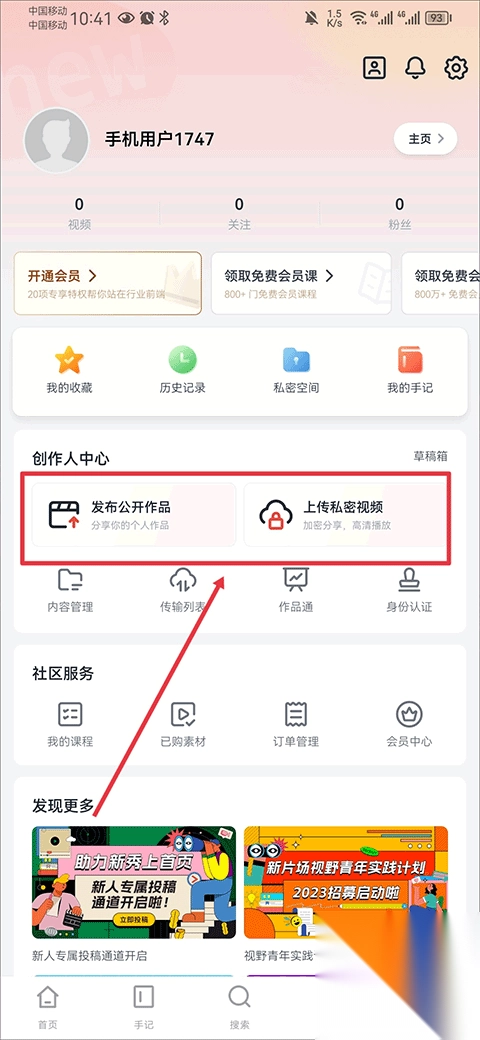1、在我的页面中选择发布公开作品或上传私密视频