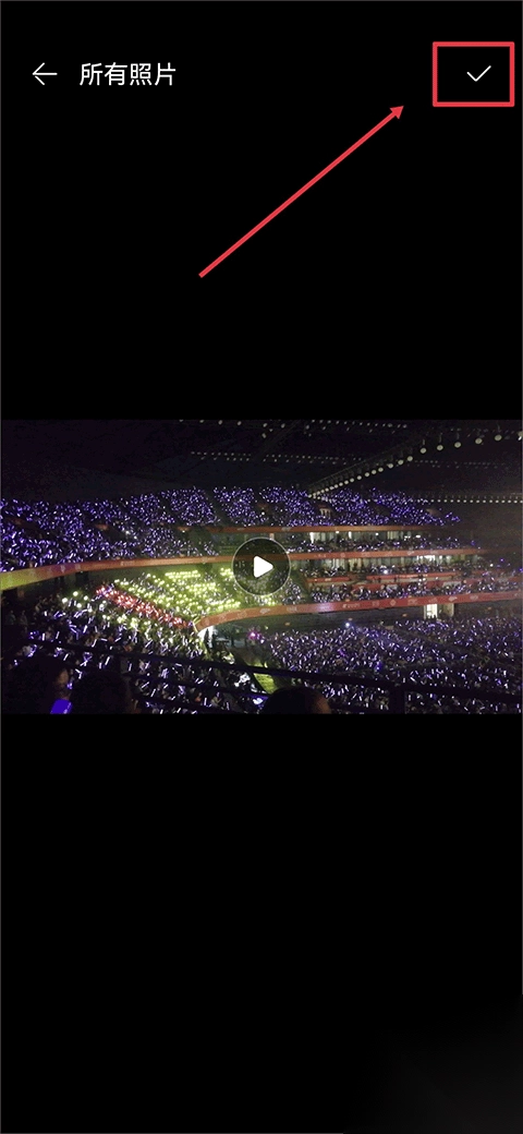 2、点击后会跳转至相册,在相册中选择你要上传的视频,选中后点击右上角勾