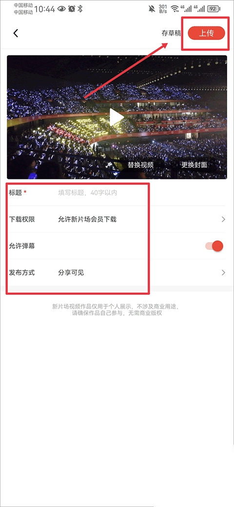 3、接下来在上传作品的页面里,完成作品标题、下载权限、弹幕允许以及发布方式的选择后,点击上传就行。