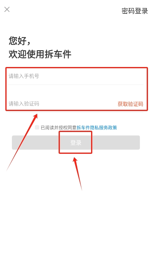 1、软件下载安装标准操作流程:在应用商店搜索拆车件官方版,下载安装完成后点击图标进入登录界面。