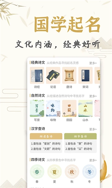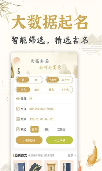 天铭宝宝起名软件,不仅对传统的五行用字进行深入剖析,还融入古文诗词曲赋的斐然文采,无疑是各位宝爸宝妈的上佳之选。