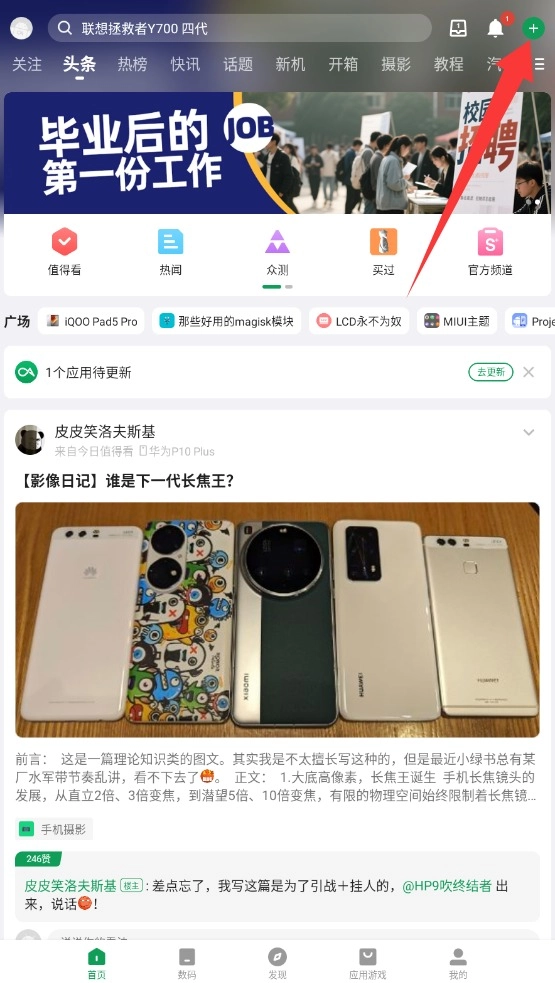 2、返回首页点击右上角"+"号按钮,进入内容编辑页面准备发布新作品。