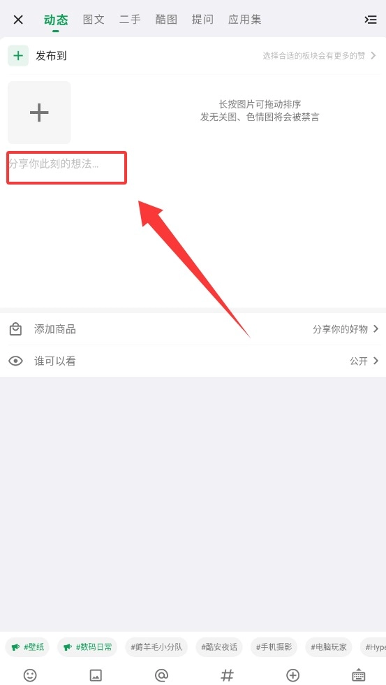 2、发动态选好分类,加几个相关标签。这样更容易被推荐,看到的人更多。