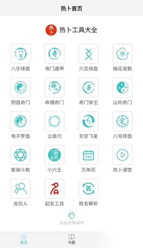 5、除了奇门遁甲功能,热卜奇门遁甲排盘app还提供了多种其他功能,如书籍这一界面中,有国学、中医、命理和奇门等