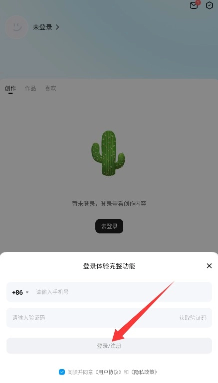 2、输入手机号获取验证短信,填写验证码并勾选用户协议,点击登录/注册进入应用。