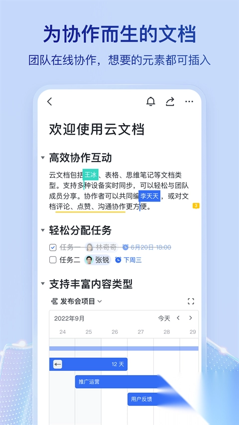 - 云文档:多人实时协同编辑,一切元素都可插入。