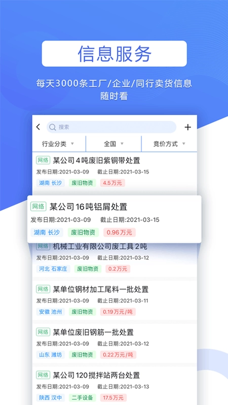 4、随时随地查看全国工厂企业废旧物资处置信息。